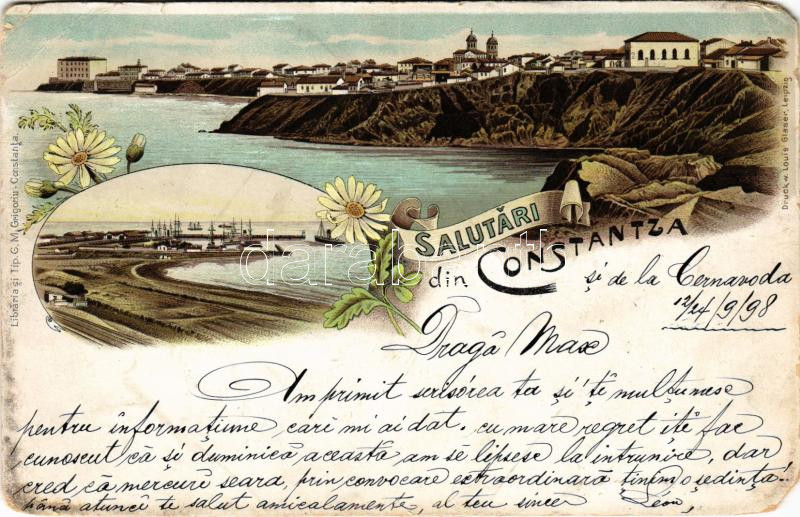 Leírás: 1898 (Vorläufer) Constanta, Constantza, Konstanca; general view, port. G. M. Grigoriu, Louis Glaser Art Nouveau, floral, litho (EM)