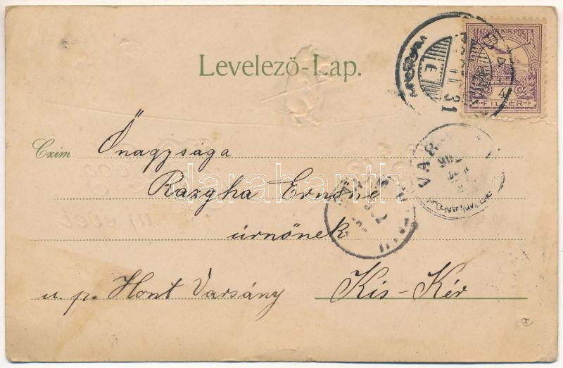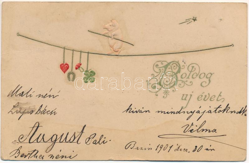 1902 Boldog Újévet! Szecessziós, dombornyomott üdvözlőlap kötéltáncoló malaccal / New Year greeting Art Nouveau Emb. postcard with tightrope walking pig (ázott / wet damage)