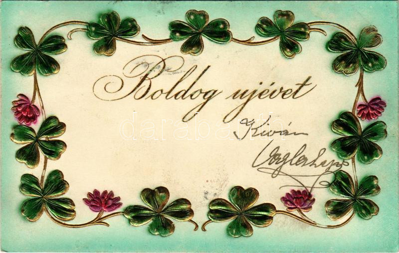 Leírás: 1903 Boldog Újévet! Szecessziós-virágos dombornyomott litho üdvözlőlap lóherékkel / New Year greeting Art Nouveau, floral Emb. litho postcard with clovers (fl)