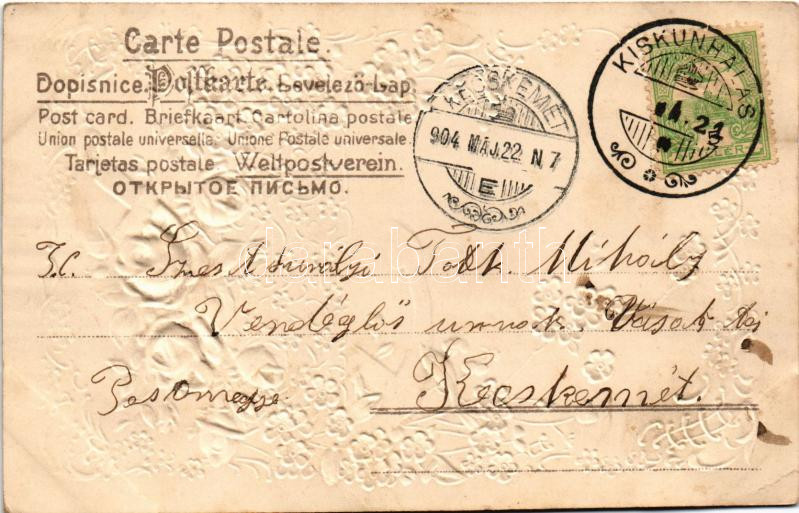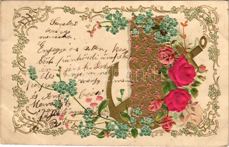 Leírás: 1904 Szecessziós-virágos dombornyomott litho üdvözlőlap selyem rózsákkal / Art Nouveau, floral Emb. litho greeting card with silk roses (EK)