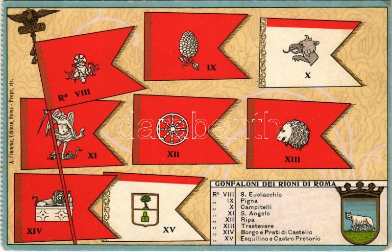 Gonfaloni dei Rioni di Roma / Banners of the districts of Rome, coat o... https://www.darabanth.com/hu/508-Gyorsarveres/508.0/Kepeslapok/Zaszlo-Cimer~670/Gonfaloni-dei-Rioni-di-Roma-Banners-of-the-districts-of-Rome-coat-of-arms-A-Fiamma-Editore-lit~II2596527