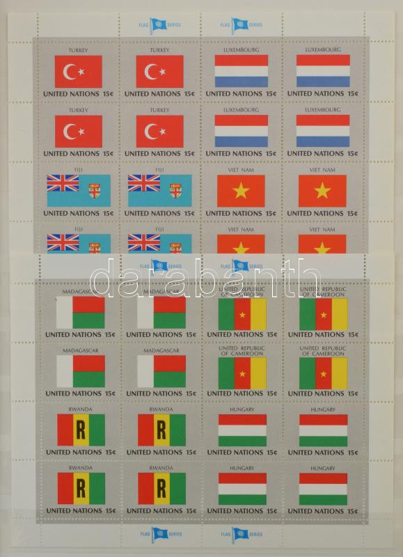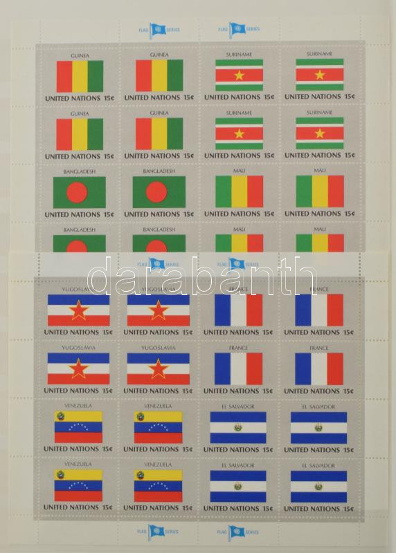 Leírás: 16 lapos A4-es berakó, benne német bélyeg sok többlet példányban, illetve ENSZ 24 db zászló kisív