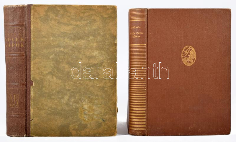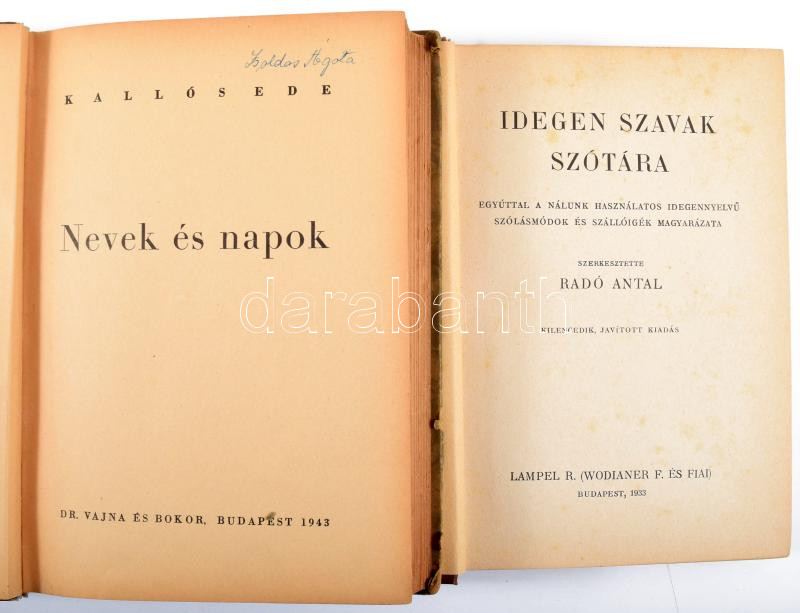 2 db könyv: Radó Antal (szerk.): Idegen szavak szótára, egyúttal a nálunk használatos idegennyelvű szólásmódok és szállóigék magyarázata. Bp., 1933, Lampel R., 189 p. Kiadói aranyozott egészvászon-kötés. + Kallós Ede: Nevek és napok. Bp., 1943, Dr. Vajna és Bokor, 383 p. Kiadói félvászon-kötés, kissé viseltes borítóval.