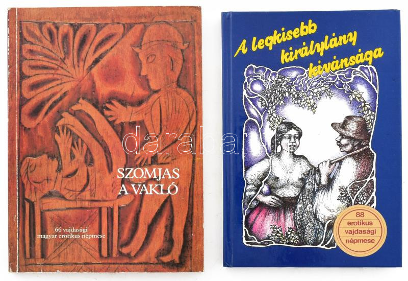 Erotikus vajdasági népmesék, 2 kötet: Szomjas a vakló. 66 vajdasági magyar erotikus népmese. + A legkisebb királylány kÃvánsága. 88 vajdasági erotikus és obszcén népmese. Gyűjtötte és az elÅ‘szót Ãrta: Burány Béla. Bp., 1988-1990, KépzÅ‘művészeti Kiadó, 138+(2) p.; 169+(9) p. Kiadói papÃrkötés / kartonált papÃrkötés, az egyik kötet minimálisan sérült borÃtóval.