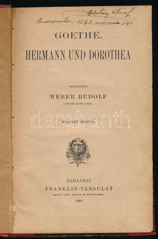 Goethe, [Johann Wolfgang von]: Hermann und Dorothea. Magyarázta: Weber Rudolf. Bp., 1889, Franklin-Társulat, 85+(3) p. Második kiadás. + Hozzákötve: Iphigenie auf Tauris. Ein Schauspiel von - - . Bev. és magyarázó jegyzetekkel ellátta: Bauer Simon. Bp., 1892, Franklin-Társulat, 157+(1) p. Második kiadás. Félvászon-kötésben, kissé viseltes borítóval, 1893-as tulajdonosi bejegyzéssel (Bölcsházy Vilma).