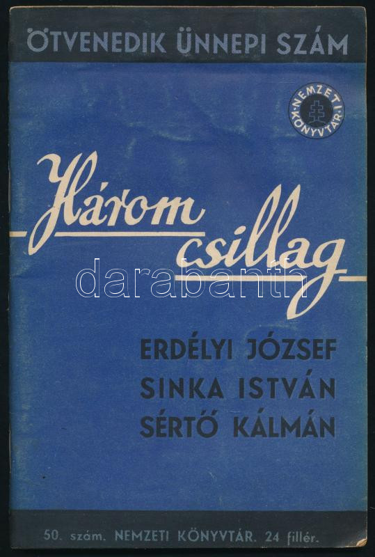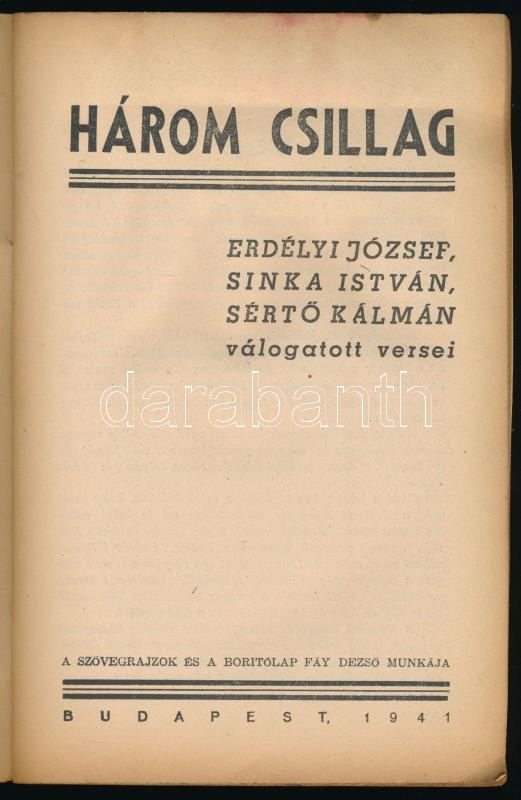 Három csillag. Erdélyi József, Sinka István, SértÅ‘ Kálmán válogatott versei. Nemzeti Könyvtár 50. sz. Bp., 1941, (Stádium-ny.), 79+(1) p. A borÃtó és a rajzok Fáy DezsÅ‘ munkái. Kiadói tűzött papÃrkötés, kissé viseltes állapotban.