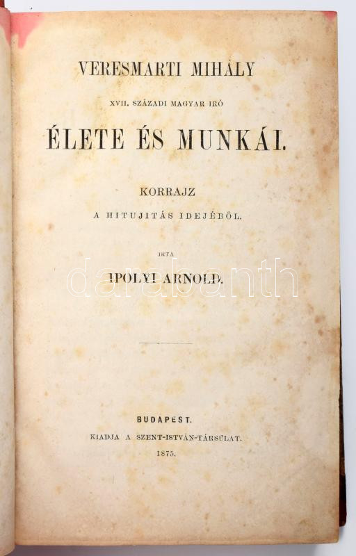 Ipolyi Arnold: Veresmarti Mihály XVII. századi magyar iró élete és munkái. I-II. köt. Korrajz a hitujitás idejéből. Házi Könyvtár XVIII-XIX. Bp., 1875., Szent István-Társulat, (Athenaeum-ny.), XX+320 p., 321-692 p. Korabeli, aranyozott gerincű félvászon kötésben