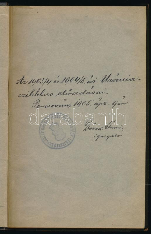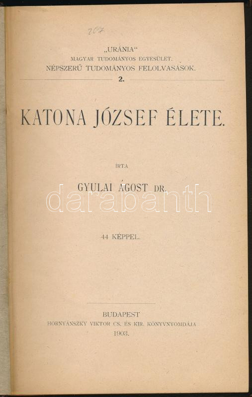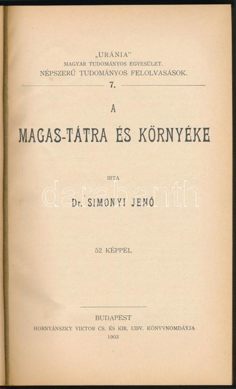 Kolligátum az ,,Uránia" Magyar Tudományos Egyesület - Népszerű tudományos felolvasások sorozat füzeteiből (15 szám egy kötetben): Gyulai Ágost: Katona József élete.; Simonyi Ernő: A Magas-Tátra és környéke.; Gerő Ödön: Budapest.; Perényi József: A gyümölcs műveléséről és értékesítéséről.; Farkas Kálmán: Háziállataik egészségéről.; Halácsy Endre: Középeurópai nagyvárosok.; Simonyi Jenő: Az Al-Duna.; stb. Bp., 1903-1905, Hornyánszky-ny. Félvászon-kötésben, kissé kopottas borítóval, a gerincen kis sérülésekkel, az elülső szennylapon 1905-ös bejegyzéssel.