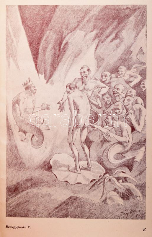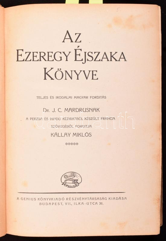 [Mardrus, Joseph Charles]: Az Ezeregy Éjszaka Könyve. Teljes és irodalmi magyar fordítás. Dr. J. C. Mardrusnak perzsa és hindu kéziratból készült francia szövegéből ford.: Kállay Miklós. V. köt. Számozott, 477./600 példány! Bp., é.n. [1923 és 1928 között], Genius (Jókai-ny.), 2 sztl. lev.+ 395 p.+ 14 (képtáblák) t. Fáy Dezső és G. Erdélyi Aranka egészoldalas rajzaival illusztrálva. Kiadói félvászon-kötés, kissé viseltes borítóval, kissé sérült gerinccel, helyenként kissé foltos lapokkal.