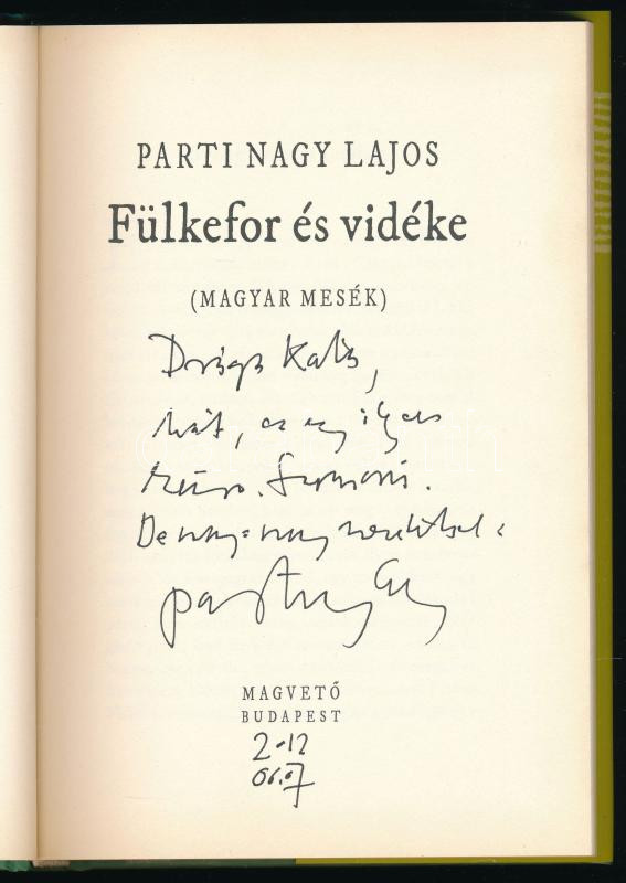 Parti Nagy Lajos: Fülkefor és vidéke. (Magyar mesék.) A szerző, Parti Nagy Lajos (1953- ) Kossuth- és József Attila-díjas költő, író által dedikált példány. Bp., 2012, Magvető. Kiadói egészvászon-kötés, kiadói papír védőborítóban.