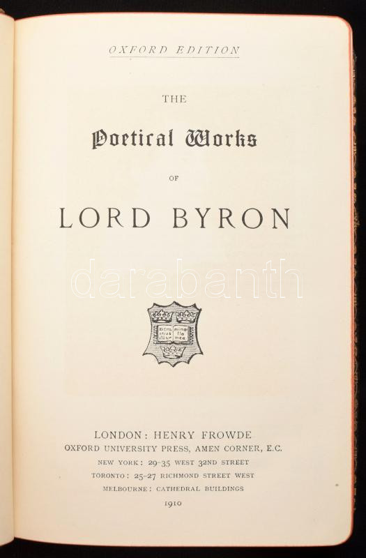 The Poetical Works of Lord Byron. London, 1910, Oxford University Press. Kiadói egészbőr kötés, aranyozott lapélek, gerinc kissé sérült, kissé kopottas állapotban.