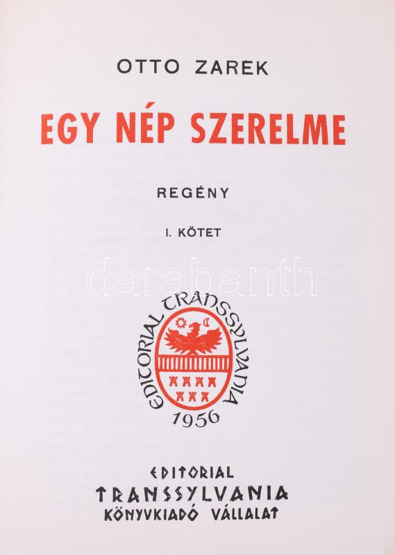 Zarek, Otto: Egy nép szerelme. I-II. köt. Regény. [Kossuth Lajos életregénye.] Ford.: Sebestyén Károly, Horváth Zoltán. Magyar Történelmi Regénysorozat 9. [Buenos Aires, 1956, Editorial Transylvania, (Danubio-ny.,), 315 p.;367+1 p. Emigráns kiadás. Kiadói aranyozott egészvászon-kötések, jó állapotban.