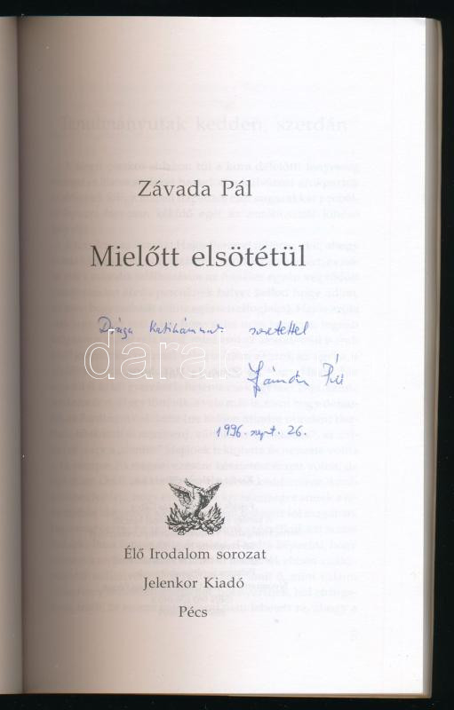 Závada Pál: Mielőtt elsötétül. A szerző, Závada Pál (1954- ) Kossuth- és József Attila-díjas író, szerkesztő, szociológus által dedikált példány. Élő irodalom sorozat. Pécs, 1996, Jelenkor, 235+(5) p. Kiadói papírkötés.