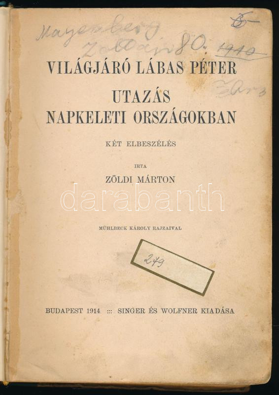 Leírás: Zöldi Márton: Világjáró Lábas Péter. Utazás napkeleti országokban. Két elbeszélés. Mühlbeck Károly rajzaival. Bp., 1914, Singer és Wolfner, 191+(1) p. Szövegközti illusztrációkkal. Átkötött félvászon-kötésben, viseltes állapotban, helyenként foltos lapokkal, a címlapon ceruzás bejegyzésekkel.