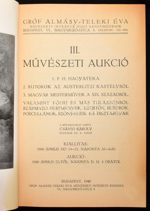Leírás: 1940 Gróf Almásy Teleki Éva Művészeti Intézete - Volt Ernst Múzeum III. művészeti aukció katalógusa 91p + XVI. t