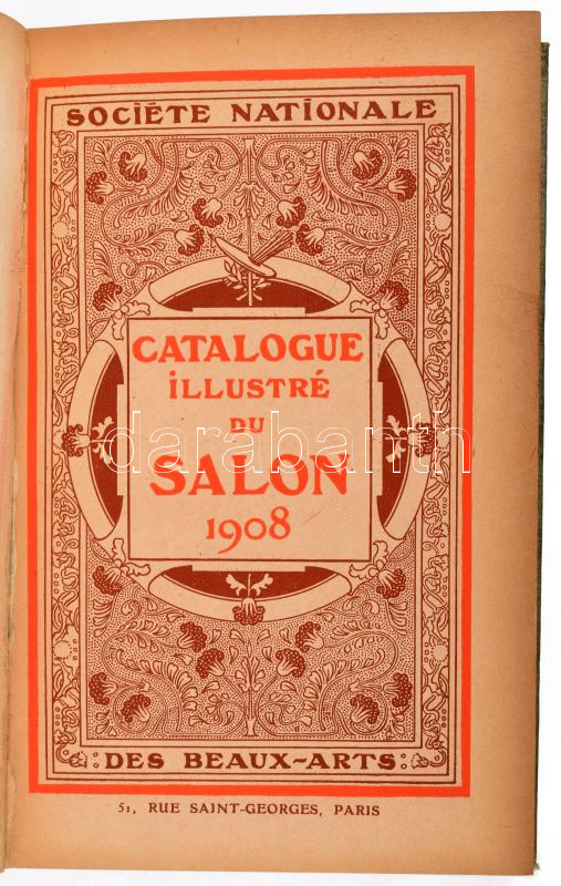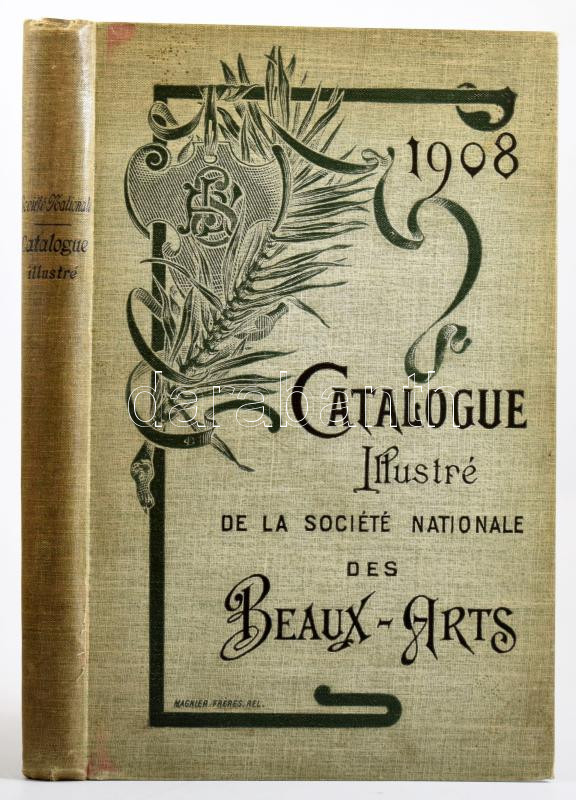 Catalogue illustré du Salon de 1908. Publié sous la direction de Ludovic Baschet. Paris, 1908, Bibliothéque des Annales, 3 sztl. lev.+LXIV+191 (fekete-fehér képekkel illusztrált)+1 p.+3 sztl. lev. Société Nationale des Beaux-Arts. Francia nyelven. Fekete-fehér képekkel illusztrált. Kiadói szecessziós egészvászon-kötés, kissé kopott borítóval, a gerincen kis sérüléssel, foltos lapszélekkel.