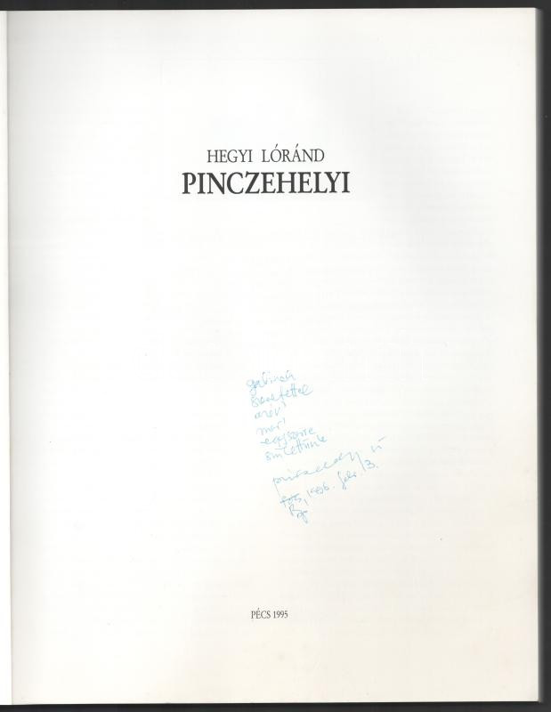 Hegyi Lóránd: Pinczehelyi. A művész, Pinczehelyi Sándor (1946- ) Munkácsy Mihály-díjas grafikus, festő által dedikált példány. Pécs, 1995, k.n., 158+(2) p. Magyar és angol nyelven. Kiadói papírkötés.