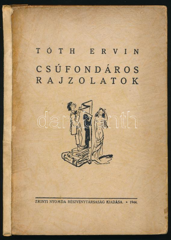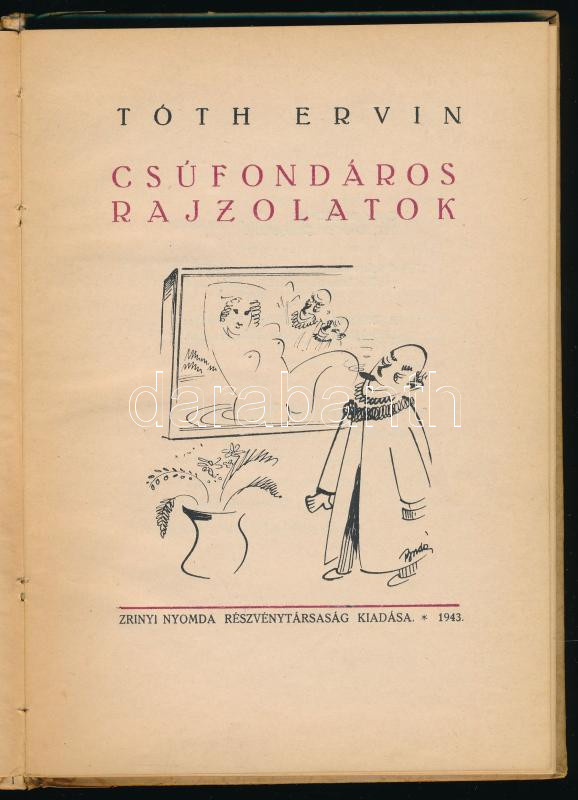 Tóth Ervin: Csúfondáros rajzolatok. Számozott (394./500), a szerző által aláírt példány! (Zalaegerszeg), 1943, Zrínyi Nyomda, 91+(1) p.+ 1 t. Egyetlen kiadás. Számos egészoldalas illusztrációval, köztük Radványi-Román Károly és Bordás Ferenc aláírt fametszetével, valamint Faragó Géza, Mata János, Molnár C. Pál, Gy. Szabó Béla, Pólya Tibor, Toncz Tibor és mások illusztrációival. Kiadói kartonált papírkötés, javított gerinccel.