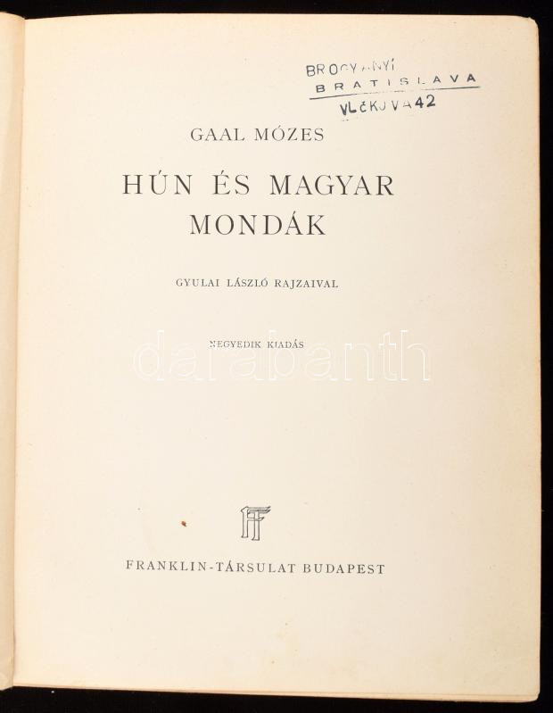 Gaal Mózes: Hún és magyar mondák. Gyulai László rajzaival. Bp.,[1930], Franklin, 215 p. Negyedik kiadás. Kiadói illusztrált félvászon-kötés, kopott borÃtóval, a könyv sarkain kis sérüléssel.