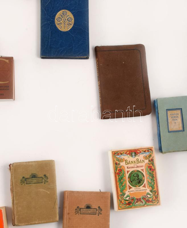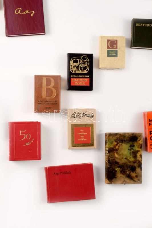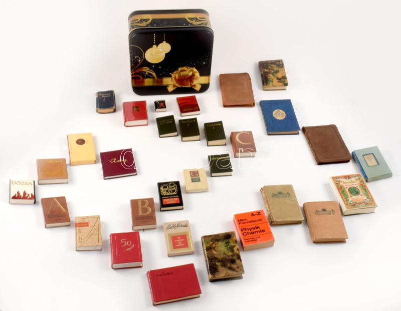 Vegyes minikönyv tétel fém dobozban: Poetica Hungarica, Könyvnyomtatás Magyarországon, Az illegális Szabad Nép, Győzelem 1945, Ady, stb., vegyes állapotban