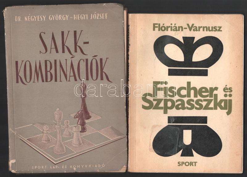 2 db sakk könyv: Négyesy György - Hegyi József: Sakk-kombinációk. (Bp., 1956), Sport, 238+(2) p. Kiadói papírkötés, sérült borítóval és gerinccel, néhány szamárfüles lappal. Megjelent 5100 példányban. + Flórián Tibor - Varnusz Egon: Fischer és Szpasszkij. Bp., 1972, Sport, 168 p. Kiadói papírkötés, kissé viseltes borítóval.