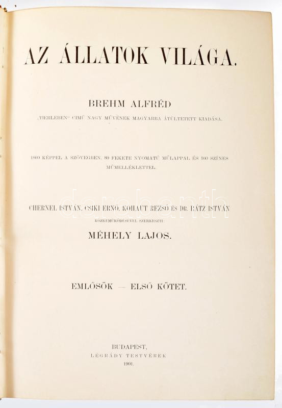 Brehm, Alfréd: Az állatok világa. - - ,,Tierleben" című nagy művének magyarba átültetett kiadása. Szerk.: Méhely Lajos. I-II. kötet. Emlősök. Bp., 1901-1902, Légrády, VIII+704 p.; XIII+(1)+703 p. Oldalszámozáson kívül fekete-fehér és színes képtáblákkal. Aranyozott gerincű, szecessziós félbőr-kötésben, a gerinceken kis sérülésekkel és kopással, nagyrészt jó állapotban.