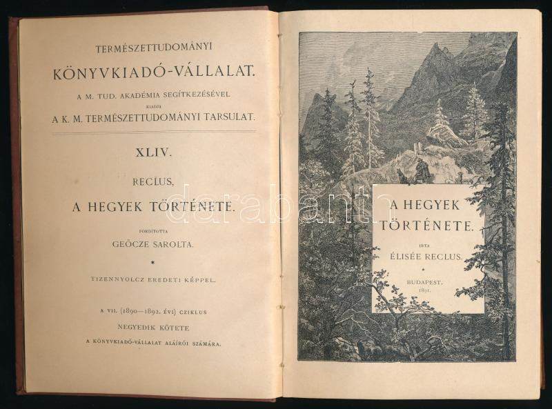 Reclus, Élisée: A hegyek története. Ford.: Geőcze Sarolta. Bp., 1891, K. M. Természettudományi Társulat (Franklin-ny.), VIII+209+(3) p. Szövegközti és egészoldalas illusztrációkkal. Kiadói egészvászon-kötés, kissé viseltes borítóval.