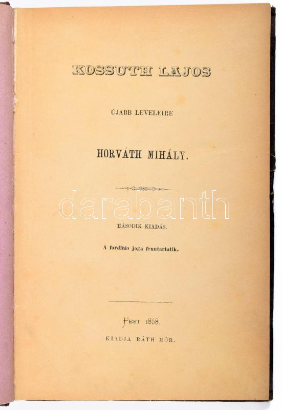 Horváth Mihály: Kossuth Lajos újabb leveleire. Pest, 1868, Ráth Mór (Bécs, Holzhausen Adolf-ny.), 131 p. Második kiadás. Korabeli, gerincén kissé sérült félvászon kötésben
