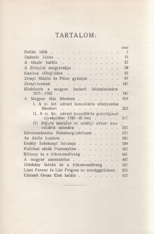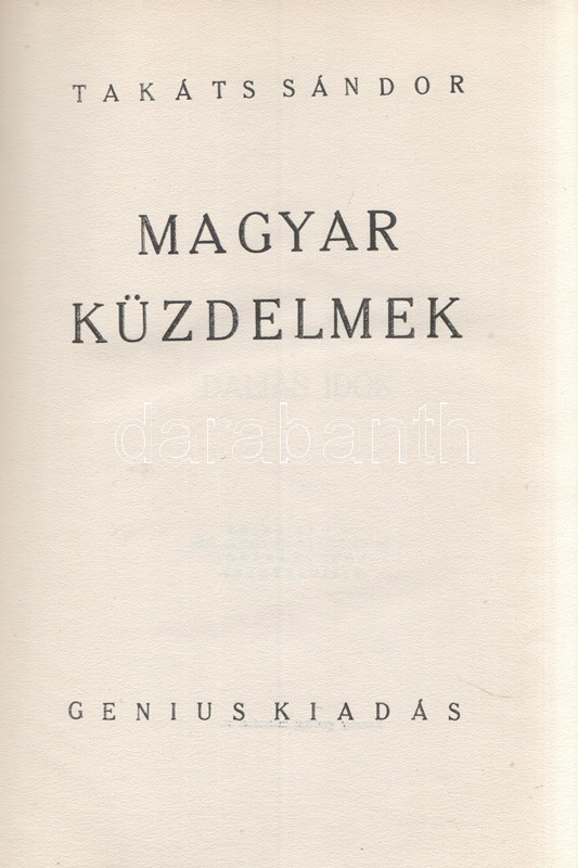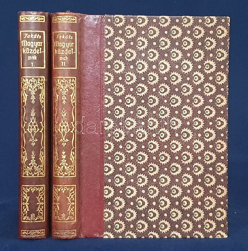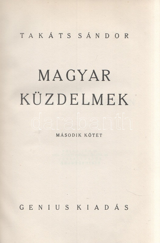 Takáts Sándor: Magyar küzdelmek. 1-2. kötet. [Teljes mű, két kötetben.] [Budapest, 1929]. Genius kiadás (Kunossy grafikai műintézet rt.) 317 + [1] p.; [4] + [319]-578 + [2] p. Első kiadás. Takáts Sándor (1860-1932) művelődéstörténész, levéltáros új szemléletű munkájában a török századokat illetően levéltári, a reformkori részleteket illetően titkosrendőrségi dokumentumok alapján dolgozta fel a magyarság XVI-XIX. századi történetét, amelyben a politikatörténet helyett a mentalitástörténet kap erős hangsúlyt. Az első előzékeken, a címoldalak verzóján és a belív néhány oldalán régi tulajdonosi bélyegzés. Egységes, kiadói, díszesen aranyozott gerincű félbőr kötésben, felül festett lapszélekkel. Szép példány.