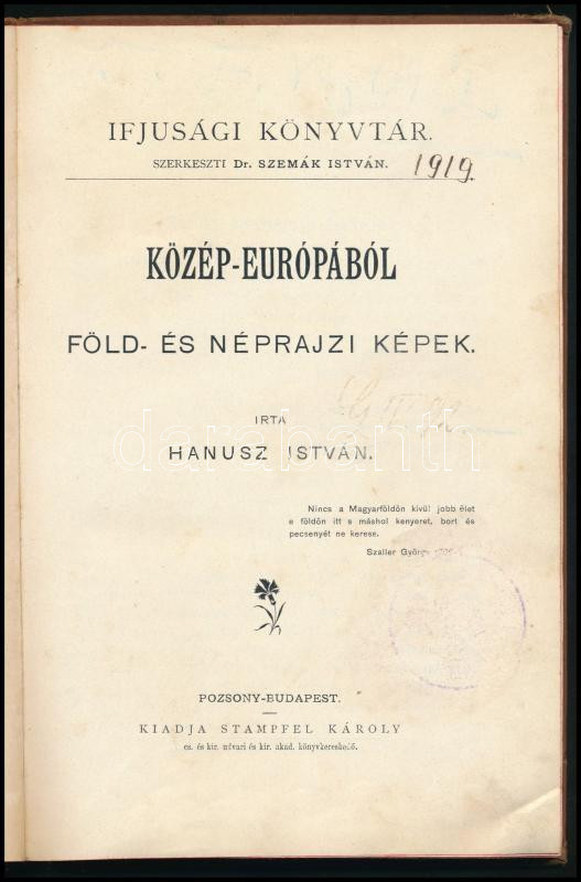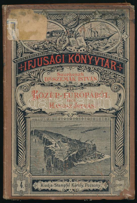 Hanusz István: Közép-Európából. Föld- és néprajzi képek. Ifjúsági Könyvtár 4. Pozsony-Bp., [1897], Stampfel Károly, 102+(2) p. Egészoldalas illusztrációkkal. Kiadói egészvászon-kötés, kissé viseltes borÃtóval, a hátsó kötéstábla sérült, helyenként kissé foltos lapokkal.