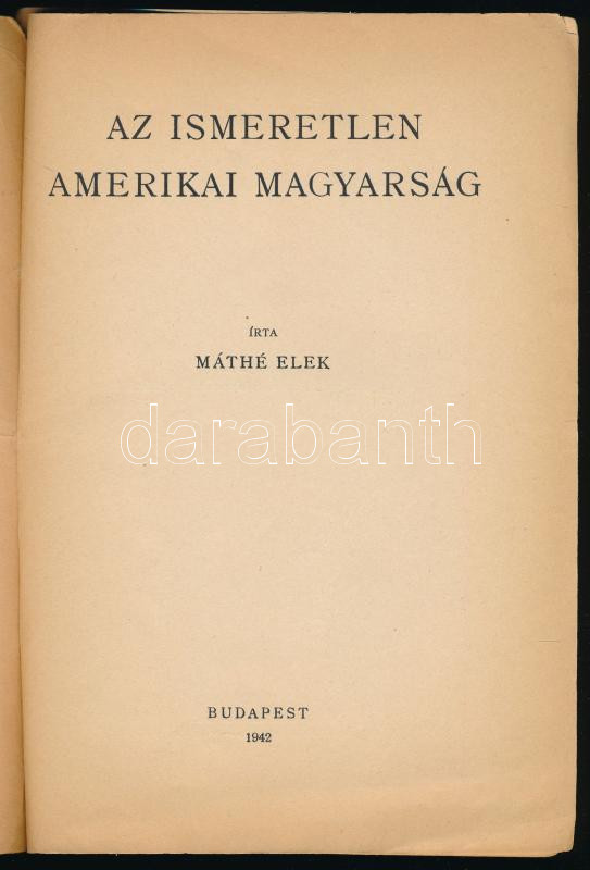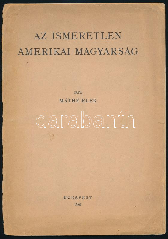Máthé Elek: Az ismeretlen amerikai magyarság. (Különlenyomat a Magyarságtudomány I. évfolyamának 4. számából.) Bp., 1942, szerzői kiadás (Franklin-ny.), 20 p. Kiadói tűzött papírkötés, sérült, a tűzéstől különvált elülső borítóval és címlappal, a hátsó borító hiányzik.