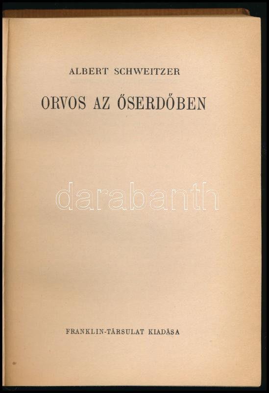 Schweitzer, Albert: Orvos az őserdőben. Ford.: Klopstock Gizella. Győrkovács László bevezetőjével. Bp., é.n., Franklin-Társulat, 165+(3) p. Félvászon-kötésben, sérült elülső szennylappal, a belső kötéstáblán ,,A rombadőlt és újjászületett Franklin Társulat 97. sz. kiadványa" címkével.
