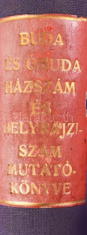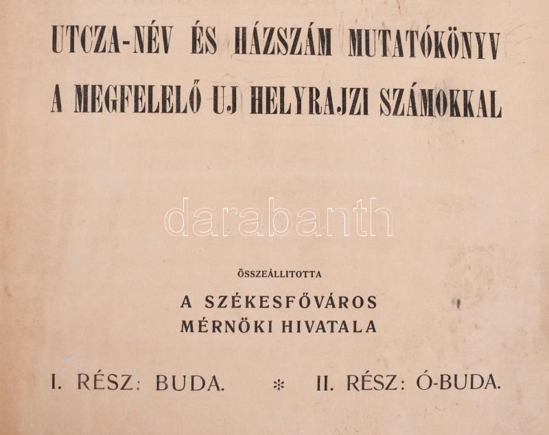 Utcza-név és házszám mutatókönyv a megfelelő uj helyrajzi számokkal. Összeáll.: a Székesfőváros Mérnöki Hivatala. I. rész: Buda. II. rész: Ó-Buda. Bp., 1903, Székesfővárosi Házinyomda, 4+451 p. Átkötött félvászon-kötés, a címlap foltos, az első és az utolsó lap javított.