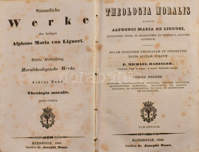 [Alphonsus Maria de Liguori (1696-1787)] Theologia moralis Sancti Alphonsi Maria de Liguori. Tomus Primus. + Tomos Septimus. Sämmtliche Werke des heiligen Alphons Maria de Liguori. Ratisbonae, 1846-1847, CXVIII+(2)+383+(1) p.; 3 sztl. lev.+ 530 p. Latin nyelven. Félvászon-kötésben, kopottas borítóval, foltos lapokkal.