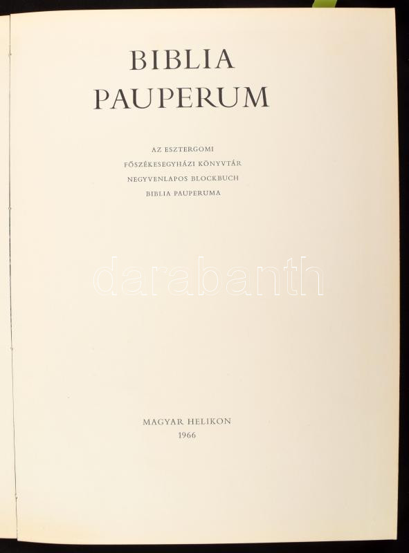 Biblia pauperum. Az Esztergomi FÅ‘székesegyházi Könyvtár negyvenlapos blockbuch Biblia pauperuma. Bp., 1966, Magyar Helikon. 2+40+XXXII p. Kiadói nylbÅ‘r-kötésben, sérült papÃr védÅ‘borÃtóban. Számozott (1191./1200) példány!