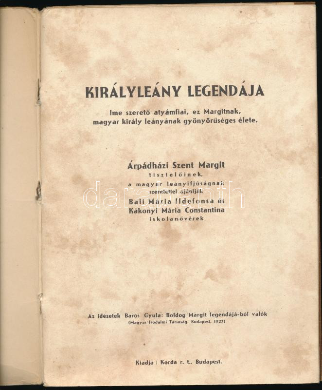 Királyleány legendája. Íme szerető atyámfiai, ez Margitnak, magyar király leányának gyönyörűséges élete. Bp., 1927, Magyar Irodalmi Társaság. Kiadói papírkötés, kissé kopottas állapotban.