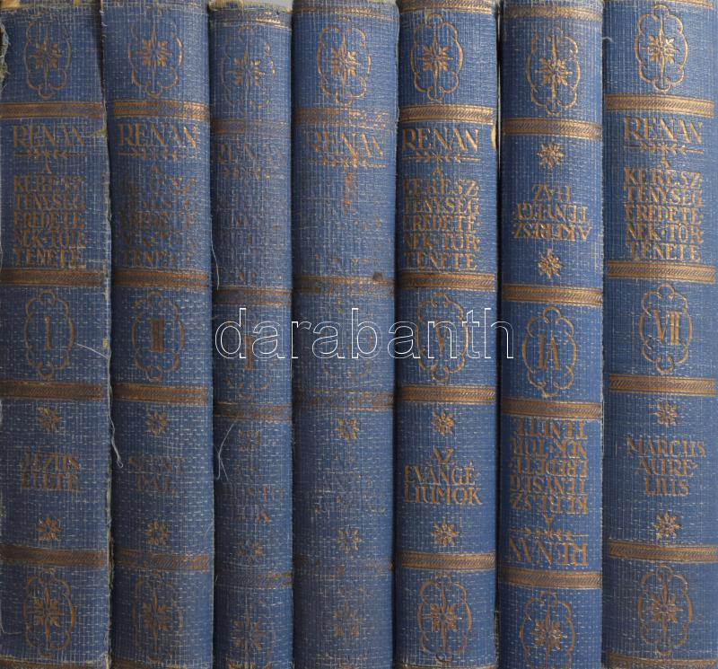 Renan, [Ernest] Ernő: A kereszténység eredetének története. I-VII. köt. [Teljes!] (1. Jézus élete. 2. Az apostolok. 3. Szent Pál. 4. Az antikrisztus. 5. Az Evangeliumok és a második keresztény nemzedék. 6. A keresztény egyház. 7. Marcus-Aurelius és az antik világ vége.) Ford.: Salgó Ernő. Bp., Dick Manó. Kiadói egészvászon kötés, sérült gerinc, kopottas állapotban.