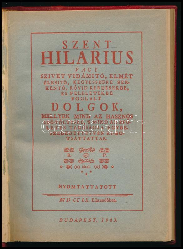 Leírás: Szent Hilarius vagy szívet vidámító [...] dolgok. Bp., 1943. Félvászon kötés, belekötve az eredeti papírborító, kopottas állapotban.