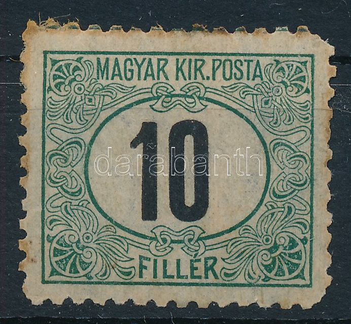 Leírás: 1903 Zöldportó 10f 11 1/2 fogazással (60.000) (rozsda / stain)