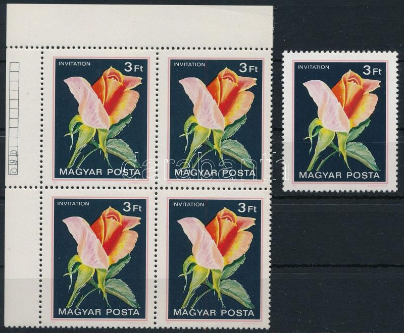 Leírás: 1982 Rózsák II. 3Ft ívsarki négyestömb színeltolódással + támpéldány