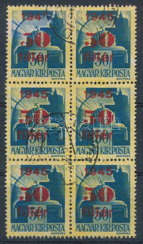 1945 Kisegítő 50f/50f hatostömb, bal felső bélyegen hiányos felülnyoma... https://www.darabanth.com/hu/508-Gyorsarveres/508.0/Magyar-filatelia-es-postatortenet/A-II-inflacio-idoszaka-1945-1946~49/1945-Kisegito-50f50f-hatostomb-bal-felso-belyegen-hianyos-felulnyomat-plus-hianyos-alapnyomat~II3441879