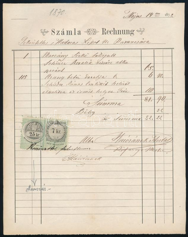Leírás: 1872 Számla 25kr + 7kr okmánybélyeggel, a 25kr bélyegen a középrész elcsúszott