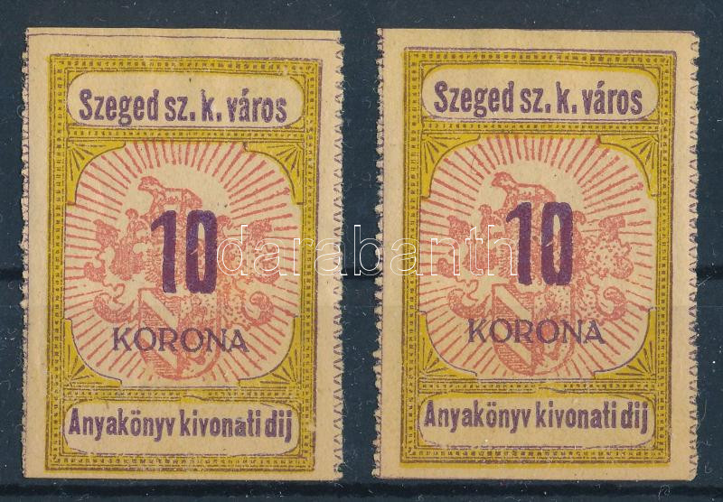 Leírás: 1918 Szeged sz. k. város anyakönyv kivonati díj 2 db városi illetékbélyeg