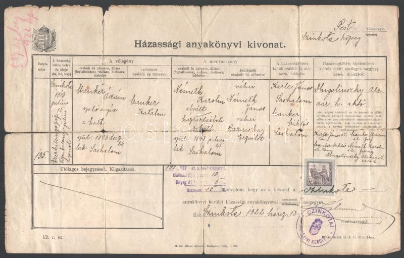 Leírás: 1924, 29 2 db anyakönyvi kivonat Budapest városi és állami illetékbélyegekkel