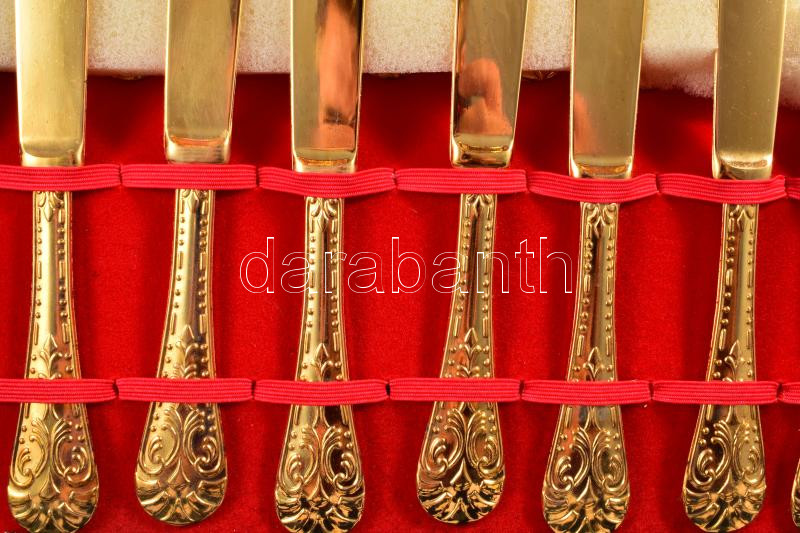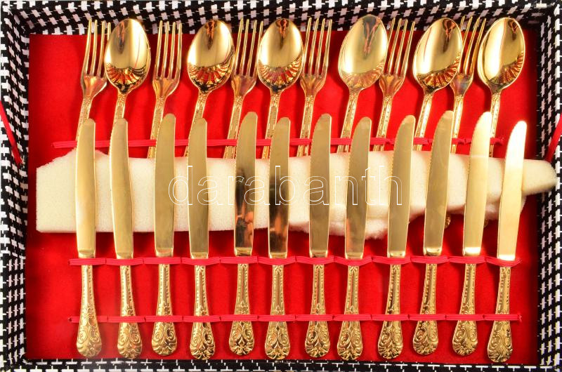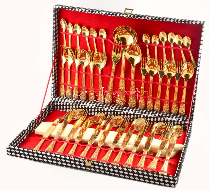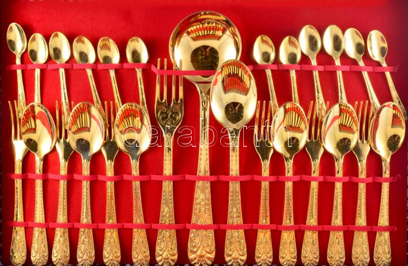 Leírás: 51 részes aranyszínű 12 személyes evőeszköz készlet, díszdobozban.