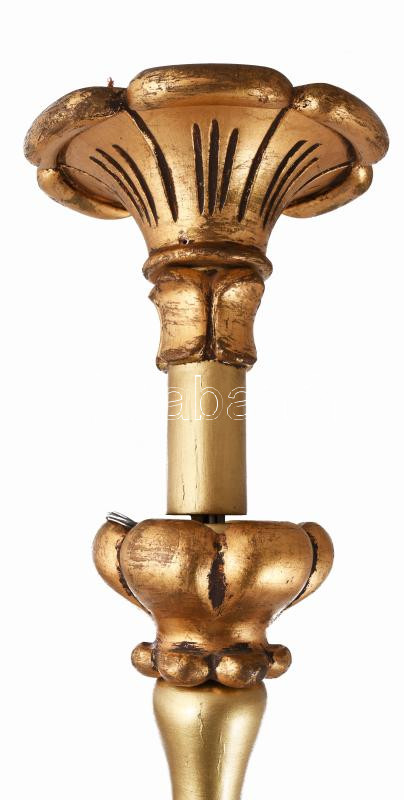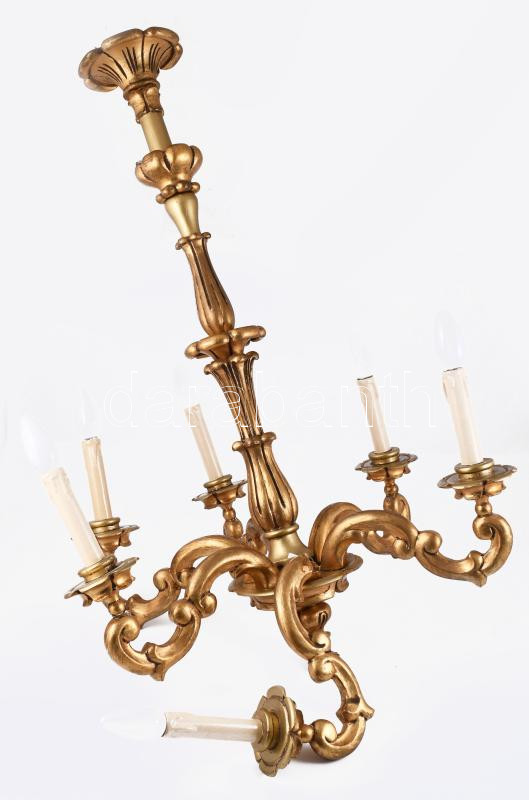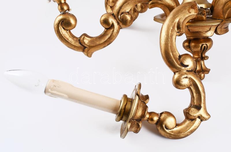 Leírás: Aranyszínű fa csillár, sérüléssel, d: 60 cm, m: 85 cm