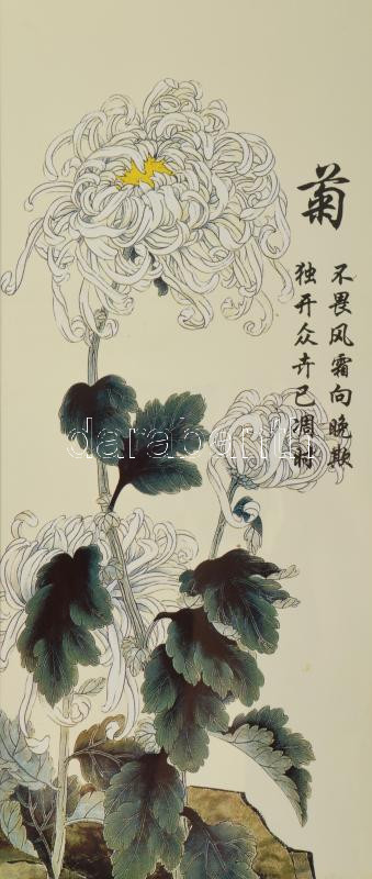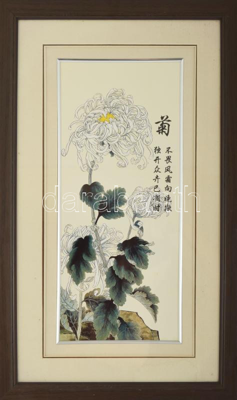 Leírás: Japán, krizantémot ábrázoló verses nyomat dekoratív keretben. 187x40 cm 34x58 cm
