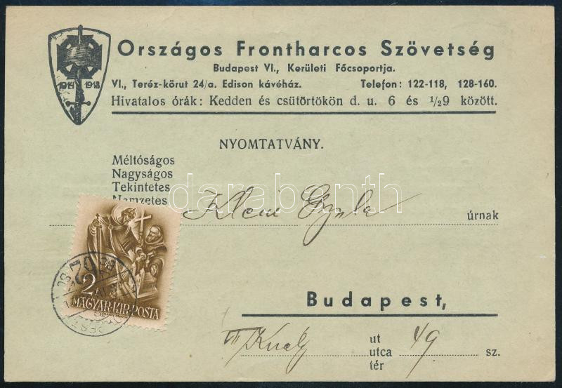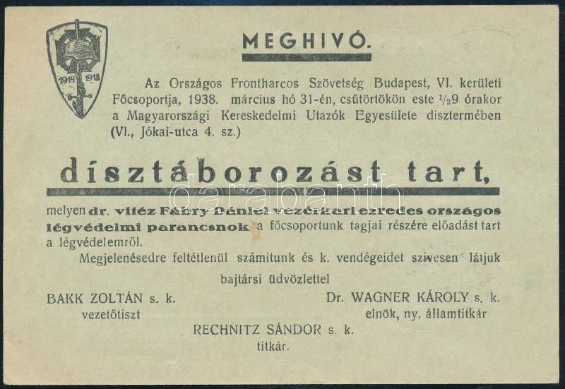 1938 Az Országos Frontharcos Szövetség VI. kerületi Főcsoportjának meghívója dísztáborozásra, ahol dr. vitéz Fábry Dániel vezérkari ezredes, országos légvédelmi parancsnok tart előadást, postán elküldve, jó állapotban