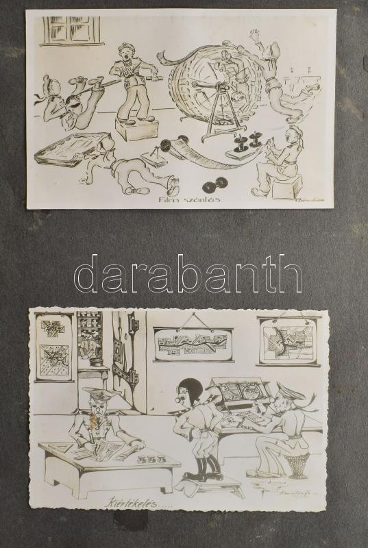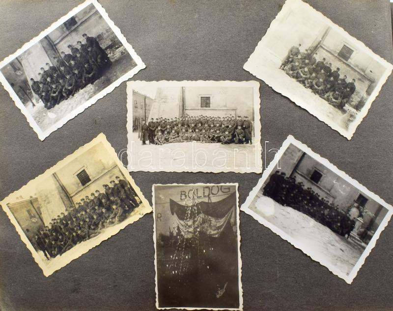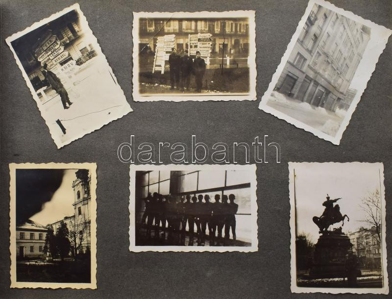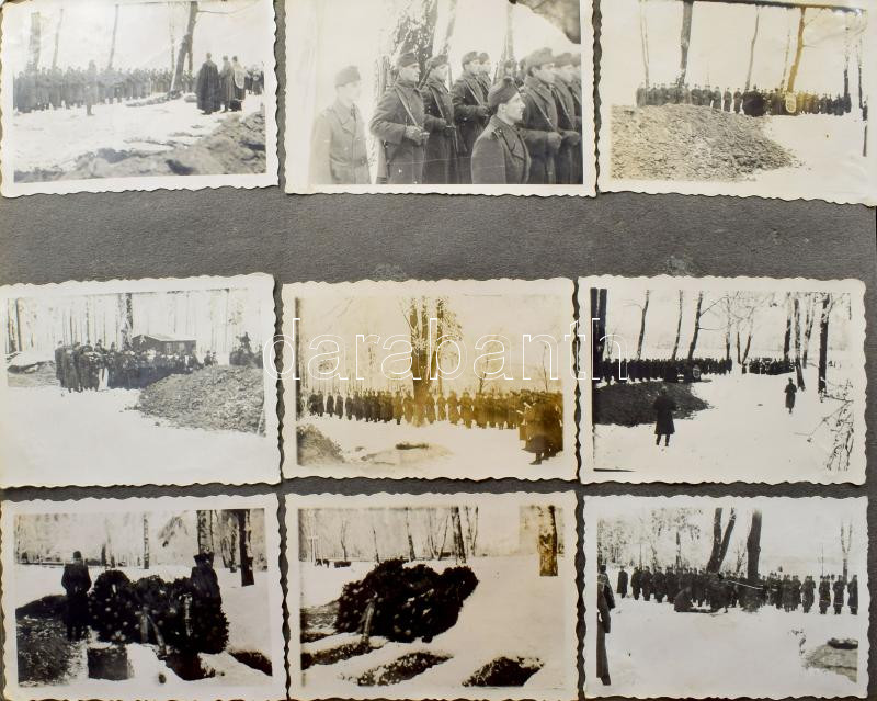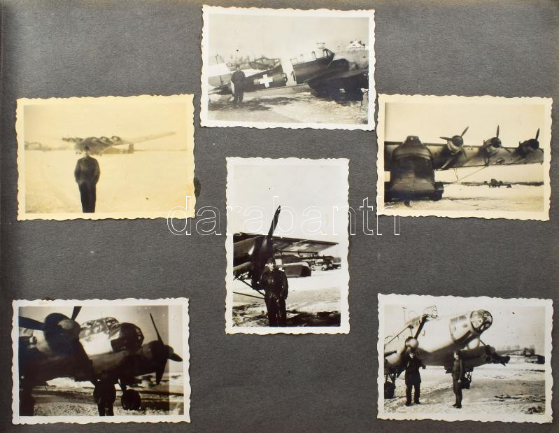 1942-43 II. világháborús pilóta felvételei, nagyrészt a keleti fronton készített fényképek. Érdekes fotók: repülőgépek, sírok, tömegsírok összesen több mint 150 fénykép albumban, feliratozva, dátumozva. 1942-43 World War II pilot's photographs, mostly taken on the Eastern Front. Interesting photos: airplanes, graves, mass graves, more than 150 photos in a total album, captioned and dated.
