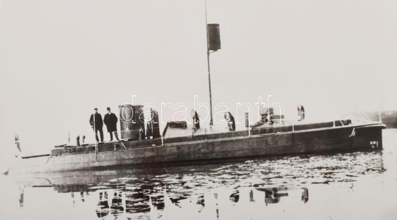 S.M.D. S.M. Patrouillenboot Lachs (ex "h"), Dunai Flottila járőr hajójának fényképe, későbbi nagyítás, 10,5x18 cm / black-and-white modern reproduction (horizontal 10.5 cm x 18 cm) from an original negative. Starboard side view of S.M.Pb. ?h? taken on the day of her launching. This same photograph is reproduced by Pawlik et al. in their Die k.u.k. Donauflotille 1970-1918, p. 153.